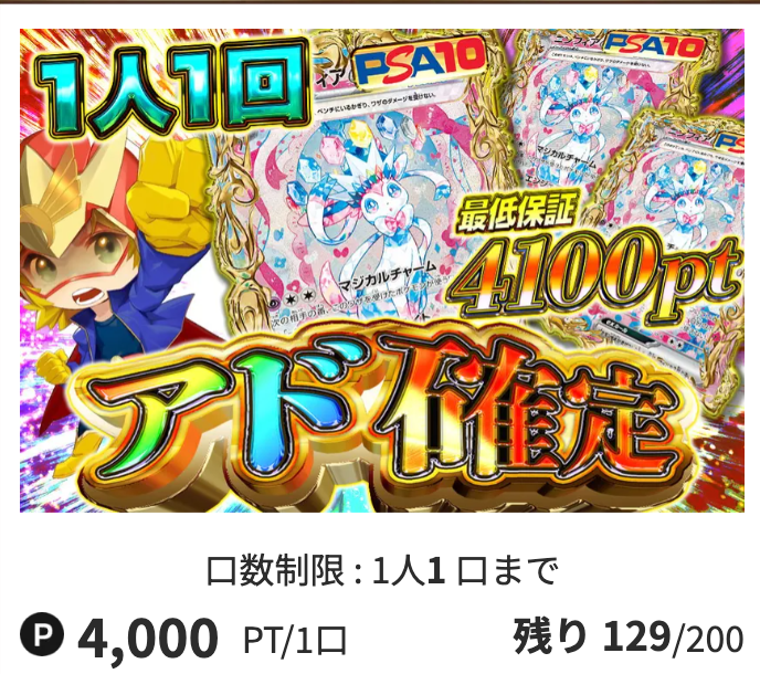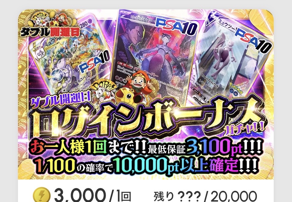 1,000ptで引ける「ログインボーナスガチャ」に挑戦しようと思ったらポイントが足りないので昨日のPSA9はポイントにしました。