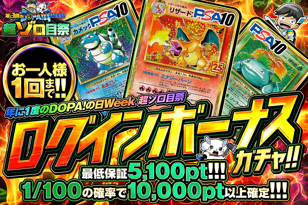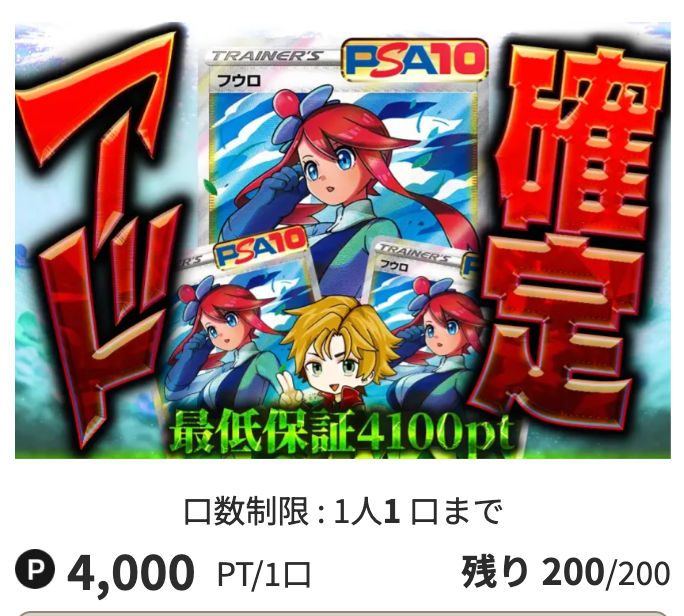 1,000ptで引ける「ログインボーナスガチャ」に挑戦しようと思ったらポイントが足りないので昨日のPSA9はポイントにしました。