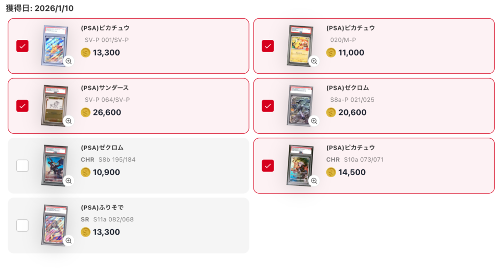 「ゼクロム」と「ふりそで」のPSA10は持っているのでポイントに変換して、5枚のPSA10を発送依頼をかけました。